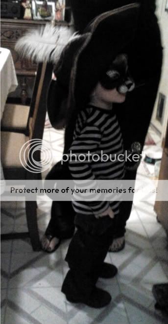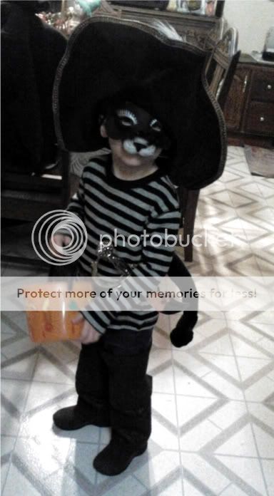 This is the first year my son has gone trick-or-treating. He had picked out and I bought a jockey costume a month ago ( It was big, he can wear it next year). But at the last minute he just HAD to be Puss-in-Boots. So Sunday afternoon last minute before I went to work I had to pull this together.